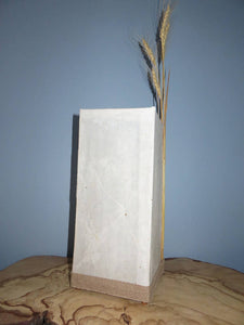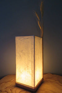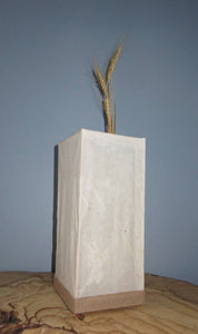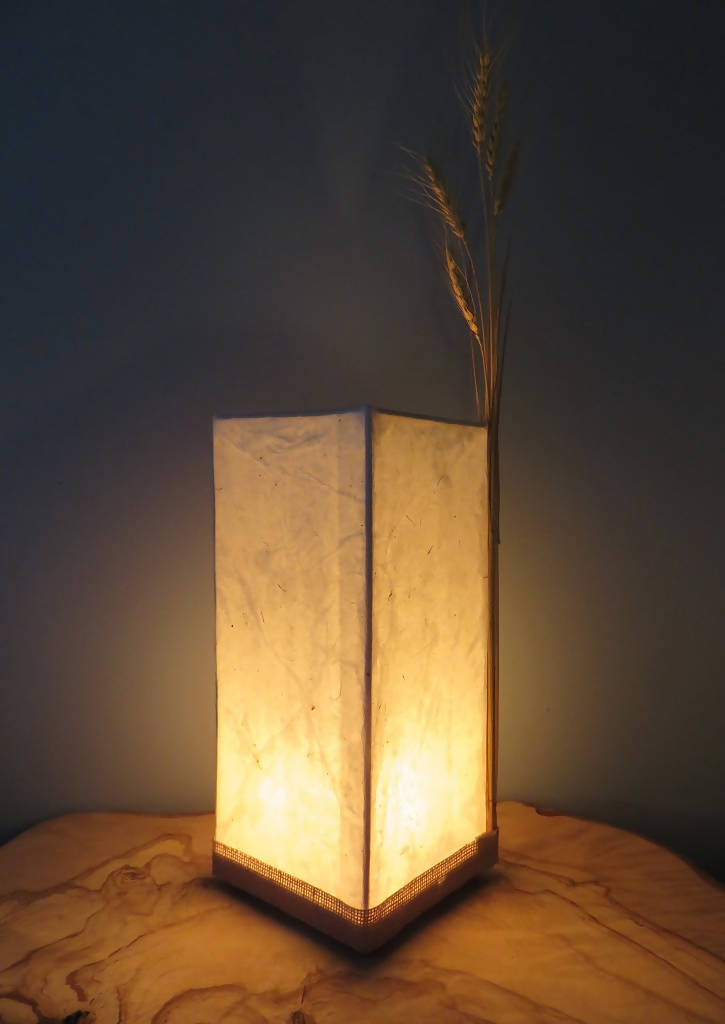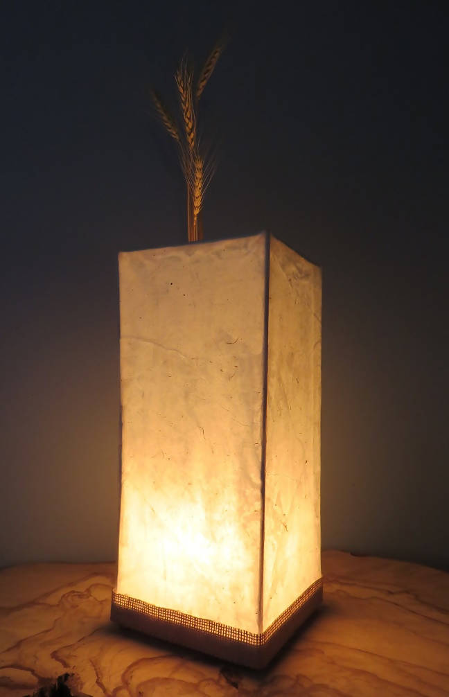 This one is all about back to the basics. A cedar base, rice paper, handmade lokta paper, burlap trim, and wheat (I think). Doesn't it just make you want to be one with nature? Measures 26” h x 5 ½”w