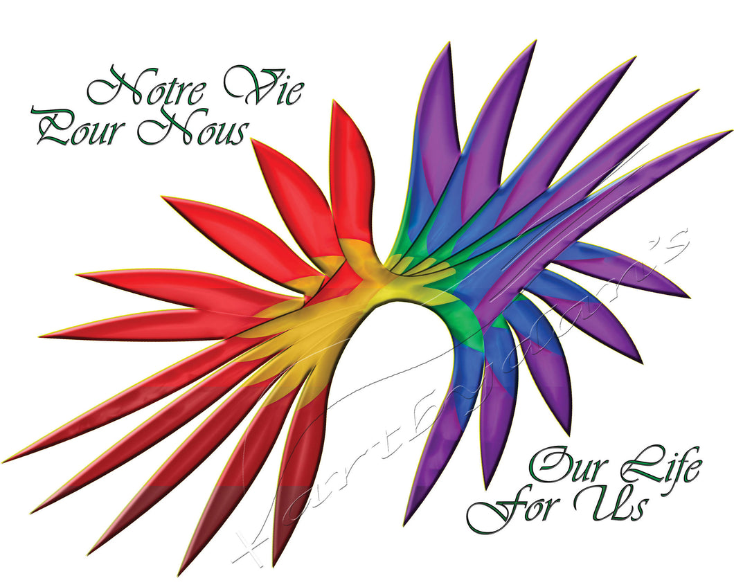 Stylized flower in Pride colours with text.
