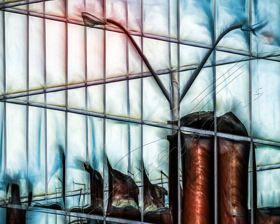 Reflections off buildings in downtown Sudbury, ON, with effects.