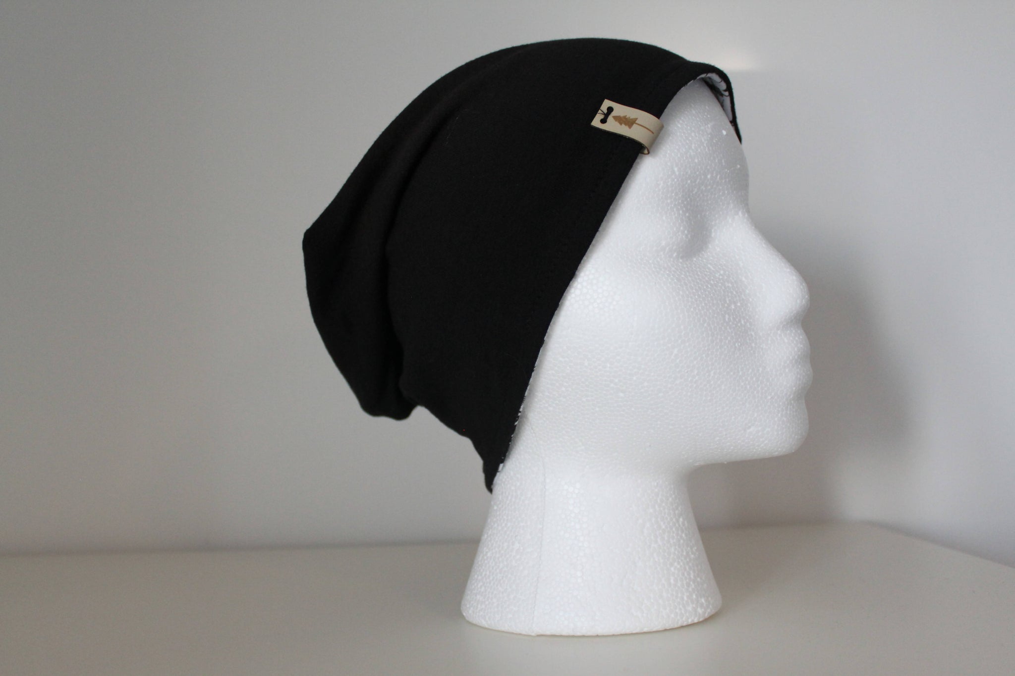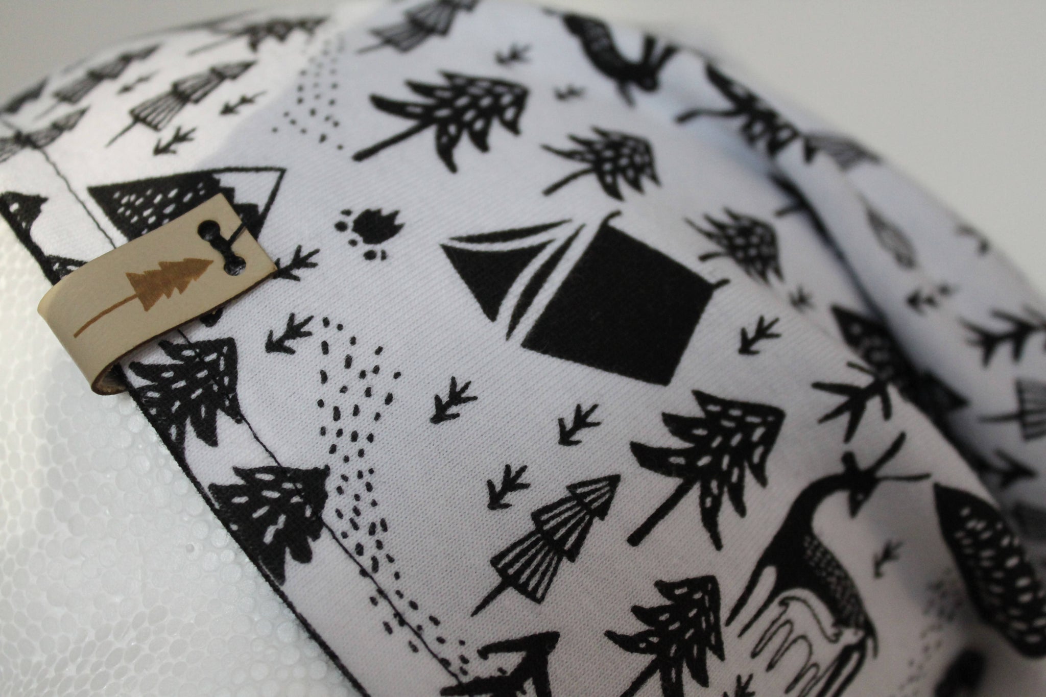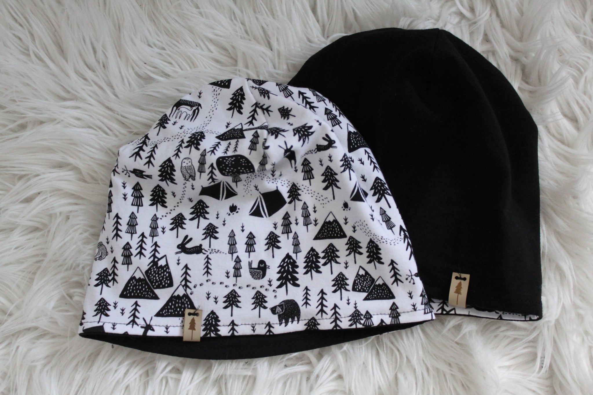 Handmade reversible black and white woodland mountains slouchy beanie hat