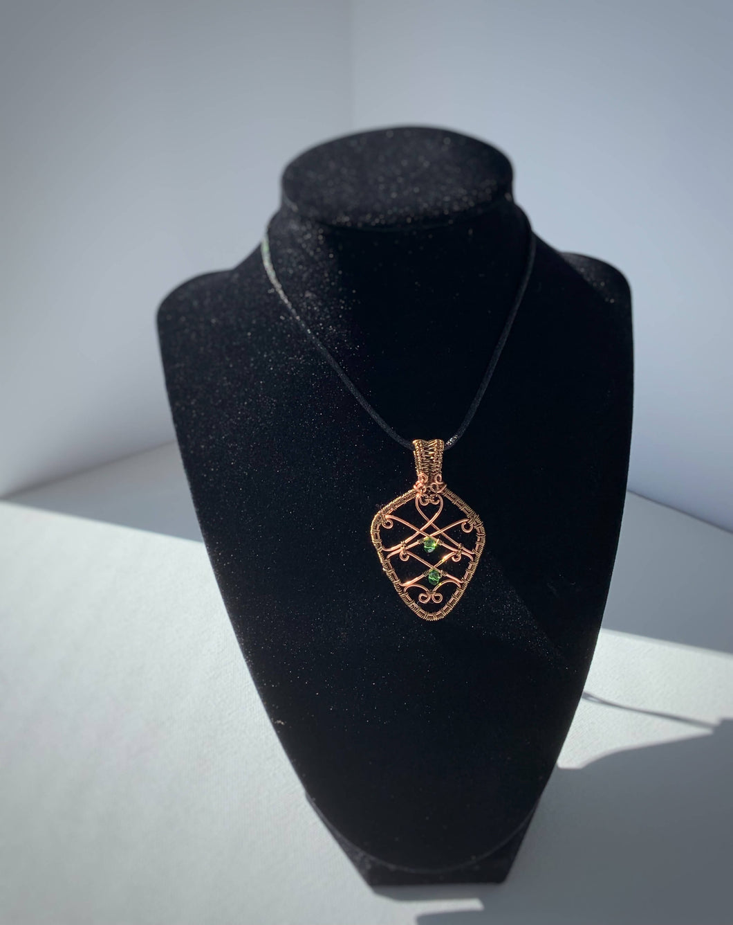 This wire wrapped filigree necklace is made of 22 gauge bare copper wire for the base and wrapping is 28 gauge antique brass in colour.