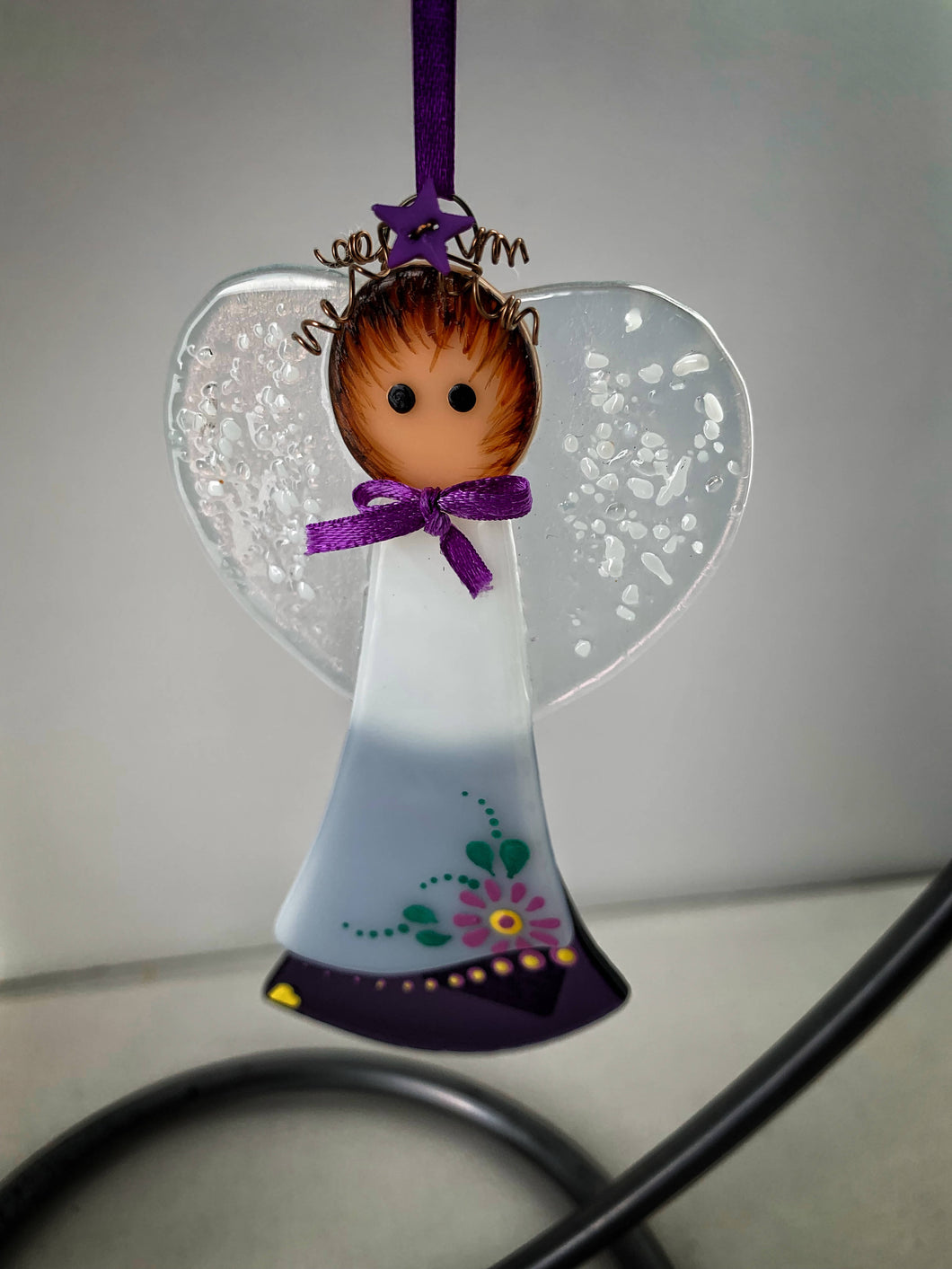 The angel is a fused glass piece with hand painted detail; you can hang in your window with suction cup (included). Measures 2 3/4" X 4".