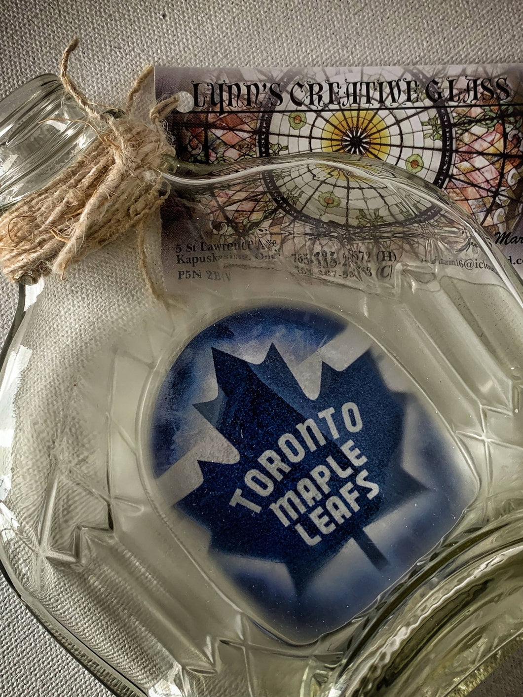 I then apply the hockey logo of your choice to the bottle.   It can be used as an art piece or as a utilitarian piece such as tray for coins and keys; as well as a serving dish for a dip or a spoon rest.  The options are limited only by the imagination.