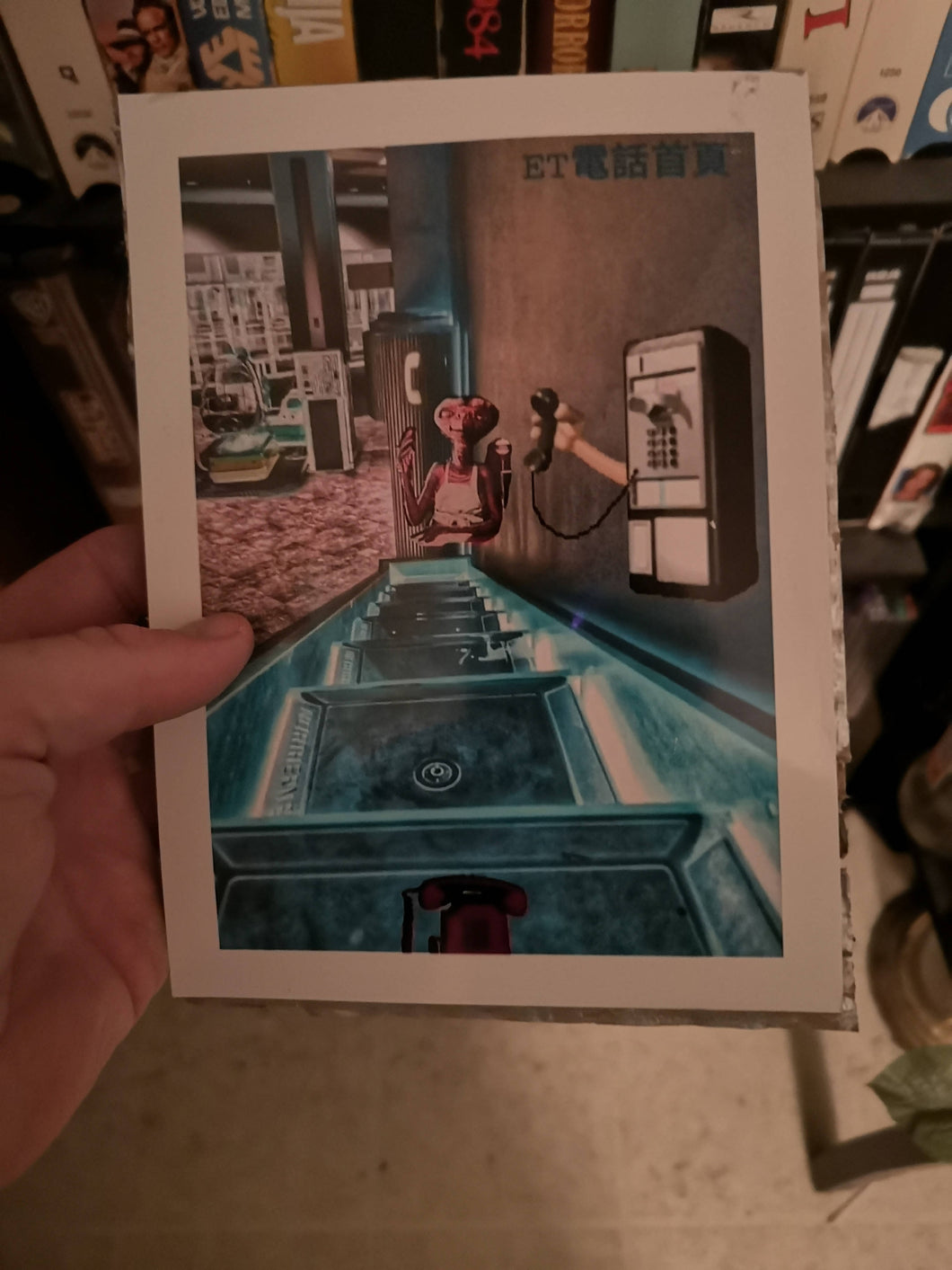 ET 'Phone Home' (in Chinese) photographic piece on cardboard .... Vaporwave art. Painted silver on back.