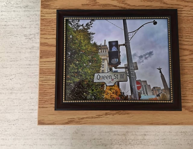 Old style street sign with Canada Life Building in background. Toronto, ON.